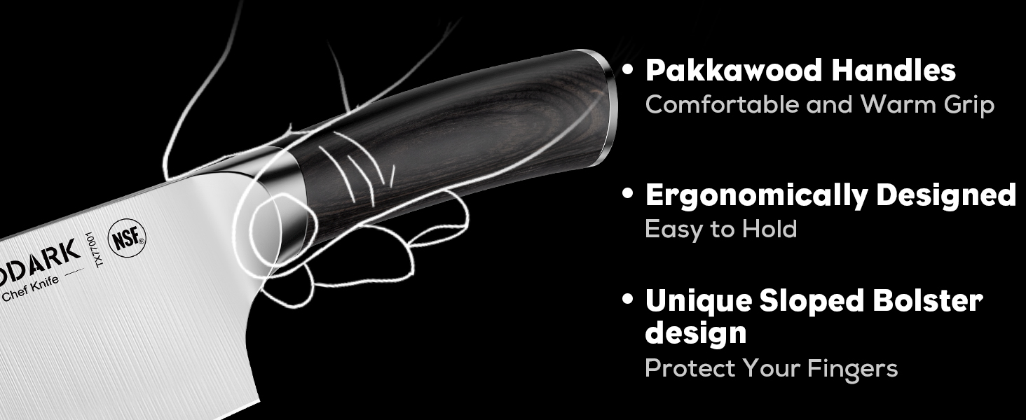 - Ergonomic Design: The handles are made of high-density pakkawood, which has high hardness and beautiful grain. Featuring an ergonomic handle design and full tang construction, this knife set provides exceptional grip, and perfect balance